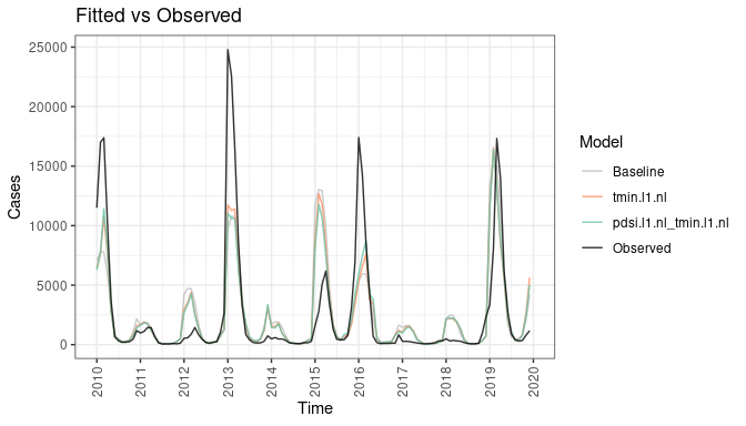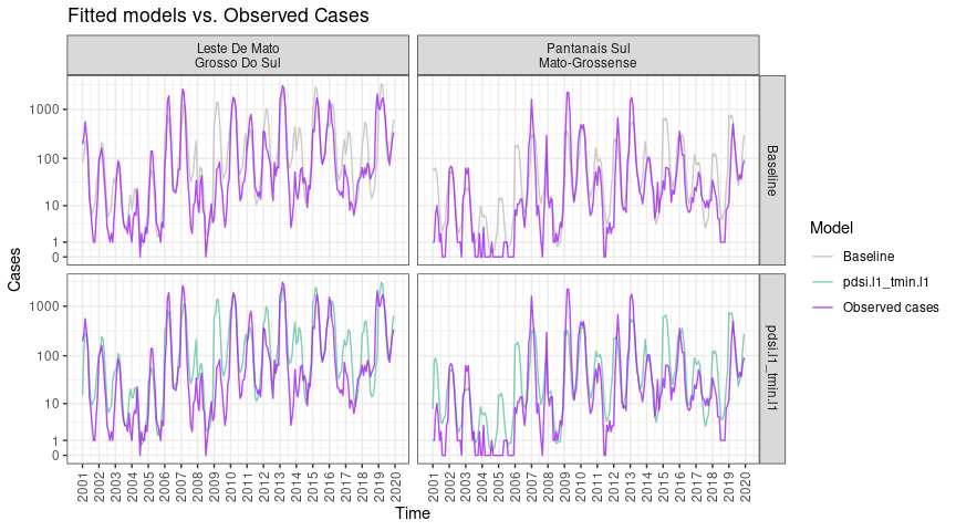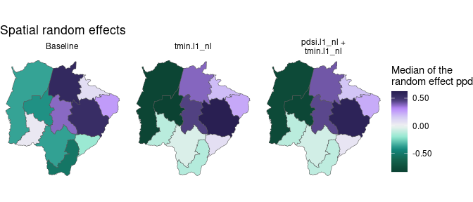 Here we observe that, in some areas, the inclusion of climate covariates in the model do not change the contribution of the spatial random effect, suggesting they are accounting for other sources of overdispersion or spatial autocorrelation (e.g., variation in interventions). In some microregions (e.g. the southernmost microregion), the inclusion of climate covariates in the model leads to a reduction in the contribution of the spatial effect, suggesting the climate may help understand some of the spatial variation in disease risk in this area.
