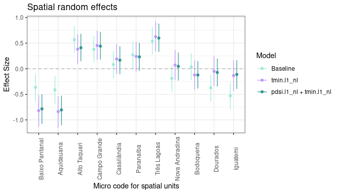 Here we create a caterpillar plot of the spatial random effects for four models. Each point represents the estimated effect for a microregion, with models compared side by side. The re_id refers to the variable used in the model to define spatial units, and re_label is used to map those to more interpretable labels (e.g., actual microregion names).